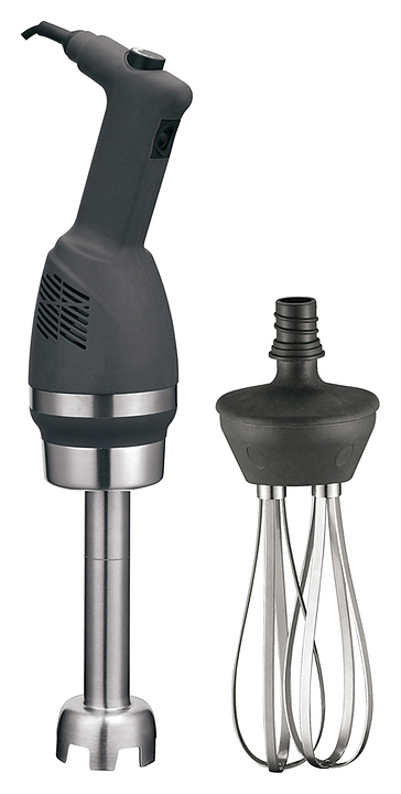 Профессиональный погружной блендер для предприятий общественного питания и торговли. Предназначен для взбивания жидкого теста, кремов и коктейлей, измельчения фруктов, овощей, орехов и трав, а также приготовления супов‑пюре. Модель оснащена вариатором скорости, что позволяет гибко настраивать режим работы под разные задачи. В комплекте — насадка‑блендер и насадка‑венчик.