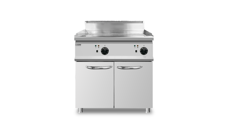 Профессиональная электрическая жарочная поверхность для предприятий общепита — ресторанов, кафе, столовых. Модель MK‑EFS7CGR оснащена двумя зонами нагрева с рифлёной рабочей поверхностью (796 × 539 мм), обеспечивающей равномерное распределение тепла и образование аппетитной корочки. При мощности 7,5 кВт устройство работает от сети 380 В. Корпус и рабочая поверхность выполнены из нержавеющей стали, что гарантирует долговечность и удобство в обслуживании. Конструкция включает наклонный профиль рифлёной поверхности и вместительный резервуар для сбора жира. Утолщённый цельнотянутый нагревательный элемент отличается высокой производительностью и энергоэффективностью. Габариты составляют 800 × 700 × 900 мм.