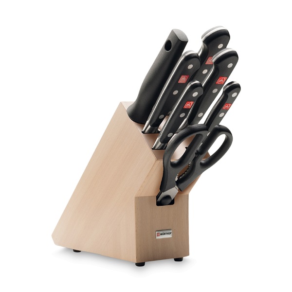Набор кухонных ножей 7 предметов в подставке Wuesthof Classic 9835-200 с действительно классическим немецким ножевым дизайном: рукоятки с развитой задней головкой, обязательный больстер, заметное широкое «брюшко» у больших ножей.