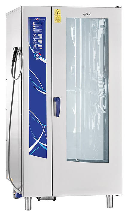 Пароконвектомат бойлерного типа для профессиональной кухни с возможностью приготовления блюд паром, горячим воздухом и в комбинированном режиме. Оборудование оснащено мембранной клавиатурой с русифицированным интерфейсом, таймером (1 минута — 9 часов 59 минут) и памятью на 110 пользовательских программ с возможностью настройки до 4 этапов.