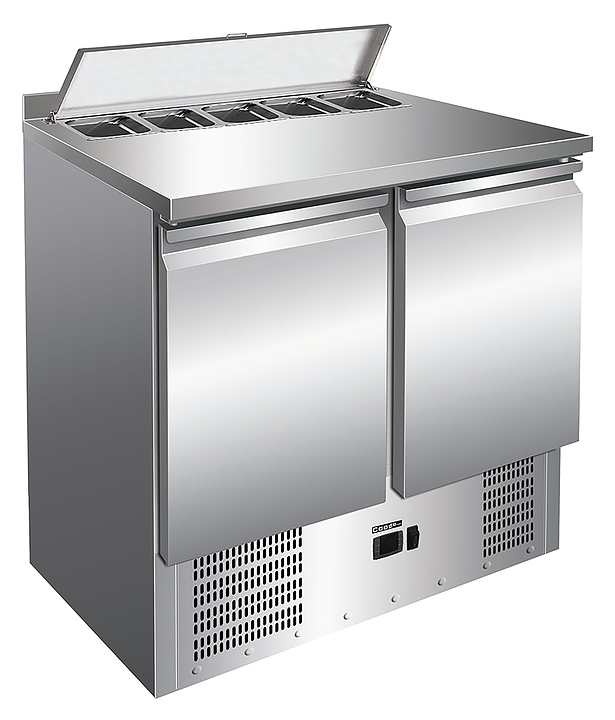 Профессиональный холодильный стол для хранения и приготовления салатов и других блюд на предприятиях общепита. Модель S901‑5GN 1/6 оснащена агрегатным отсеком, расположенным снизу, столешницей с бортом и двумя холодильными камерами с дверьми. В каждой секции предусмотрены одна полка и пара направляющих под гастроёмкости GN 1/1. Рабочая поверхность из нержавеющей стали служит удобной столешницей, что позволяет рационально использовать рабочее пространство. Корпус выполнен из нержавеющей стали — материала, отличающегося прочностью, долговечностью, устойчивостью к загрязнениям и простотой очистки.