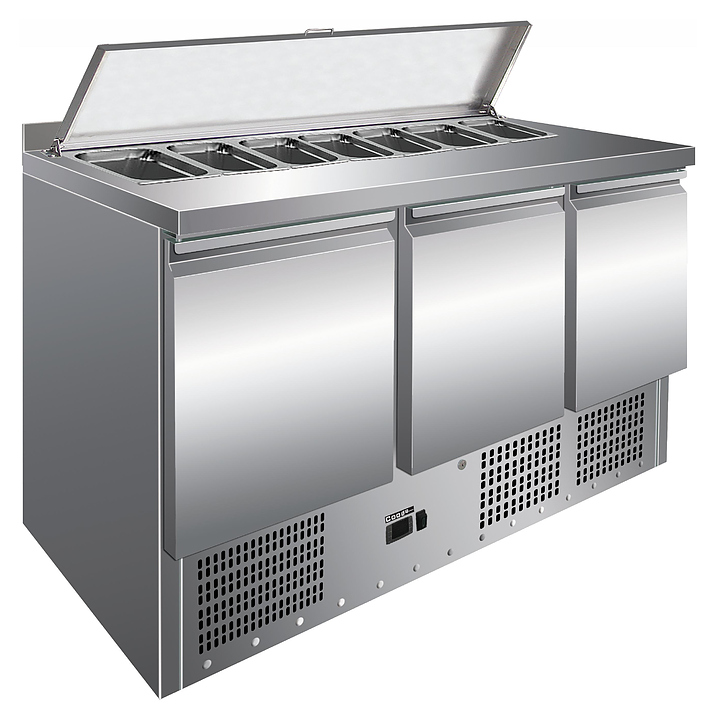 Профессиональный холодильный стол для хранения и приготовления салатов и других блюд на предприятиях общепита. Модель S903‑7GN 1/3 оснащена агрегатным отсеком, расположенным снизу, столешницей с бортом и тремя холодильными камерами с дверьми. В каждой секции предусмотрены одна полка и пара направляющих под гастроёмкости GN 1/1. Рабочая поверхность из нержавеющей стали выполняет функцию удобной столешницы, позволяя оптимизировать использование рабочего пространства. Корпус изготовлен из нержавеющей стали — материала, который отличается прочностью, долговечностью, устойчивостью к загрязнениям и простотой в очистке.