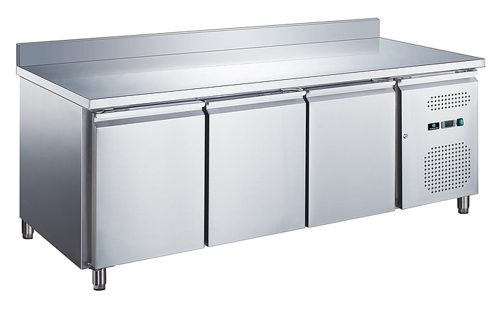 Профессиональный холодильный стол для предприятий общественного питания. Предназначен для раскатки теста и обработки ингредиентов, а также для охлаждения и хранения продуктов и напитков. Модель оснащена охлаждаемой камерой объёмом 417 л с динамическим охлаждением и температурным режимом от −2 ∘C до +8 ∘C. Столешница из нержавеющей стали с бортом обеспечивает удобство работы и долговечность конструкции. Холодильный агрегат расположен сбоку (справа), предусмотрены три секции с дверьми. Используется хладагент R290.