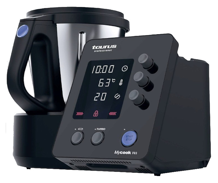 Профессиональный термомиксер для комплексного приготовления блюд на предприятиях общепита и торговли. Модель Mycook Pro выполняет измельчение, смешивание, замешивание теста, взбивание, приготовление соусов, кремов, смузи, супов‑пюре, ароматизированных масел, фарша, кондитерских эмульсий и других продуктов. Оснащён индукционной технологией на основе электромагнетизма, чашей из нержавеющей стали с универсальным ножом, дисплеем с индикацией времени, регулятором скорости и температуры. Корпус выполнен из пластика. Устройство обеспечивает точный контроль процесса за счёт регулировки скорости и температуры в широких диапазонах.