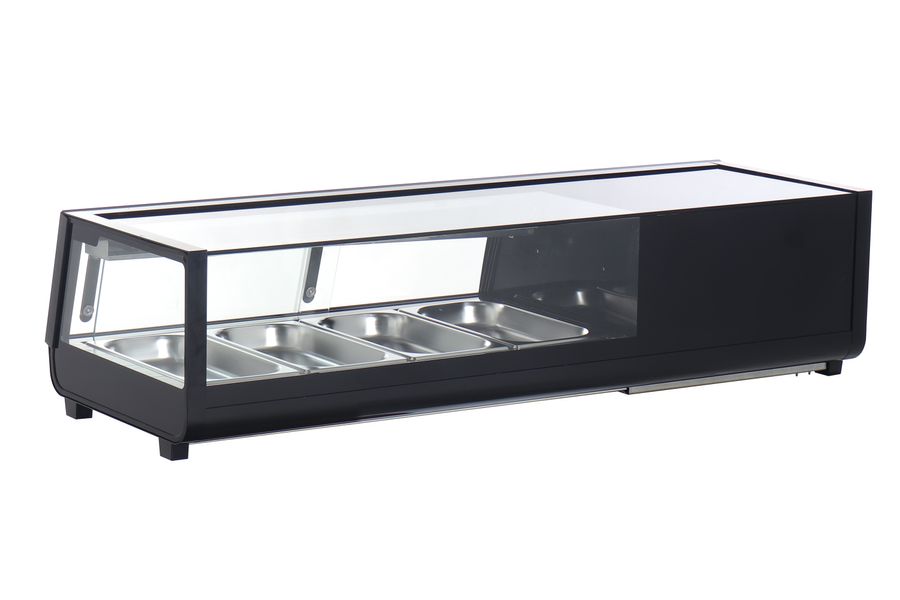 Настольная холодильная витрина для демонстрации, охлаждения и кратковременного хранения продуктов на предприятиях общепита — в кафе, ресторанах, пиццериях, столовых. Модель VA‑RTS‑42 имеет охлаждаемый объём 42 л и поддерживает температурный режим до 12 °C. Оборудование оснащено статической системой охлаждения и функцией автоматической разморозки. Для удобства эксплуатации предусмотрены цифровой регулятор температуры с дисплеем, раздвижные двери‑купе и переднее изогнутое стекло. Встроенная светодиодная подсветка сверху улучшает визуальную презентацию продукции. Верхний испаритель оснащён резервуаром для сбора конденсата. При мощности 0,18 кВт устройство работает от сети 220 В. Хладагент — R600а. Габариты составляют 1174 × 426 × 296 мм. Витрина совместима с гастроёмкостями типа GN 1/3 (вмещает 4 шт.).